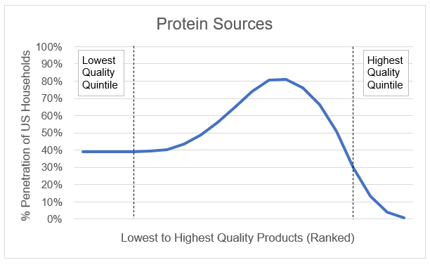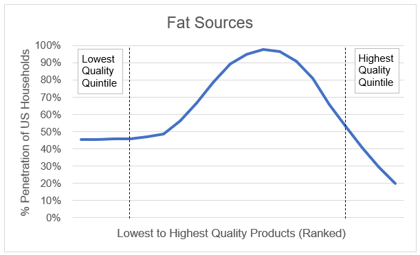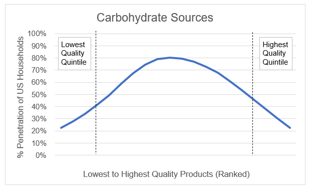 I would like to introduce an oversimplified framework for evaluating quality. First, stack rank all products in a category according to a hypothetical “quality score”. Then, for each “quality score” decile, determine what % of the US population is regularly consuming such products on average. Arguably, two individuals will have different views on ranked “quality scores” but let us assume the rankings across say all ~50,000 food and beverage products at Walmart or Kroger, informed by probabilities associated with scientific research, would be directionally accurate. For example, most consumers would rank organic broccoli much higher than Skittles.
